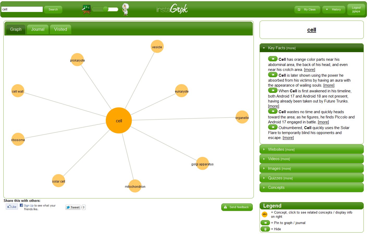 Instagrok es un servicio web 2.0 educativo, que consiste en un buscador que nos muestra pequeños esquemas sobre el tema que hayamos buscado. Podemos ir profundizando más y más en el campo buscado y, para cada apartado, hay fotos, vídeos, información e incluso pequeñas pruebas que ayudaran a comprobar si hemos entendido el concepto. Mencionar que la interfaz está enteramente en ingles, pero que a la hora de buscar, podemos hacerlo en español, aunque el sistema dará fallos a la hora de enlazar conceptos.